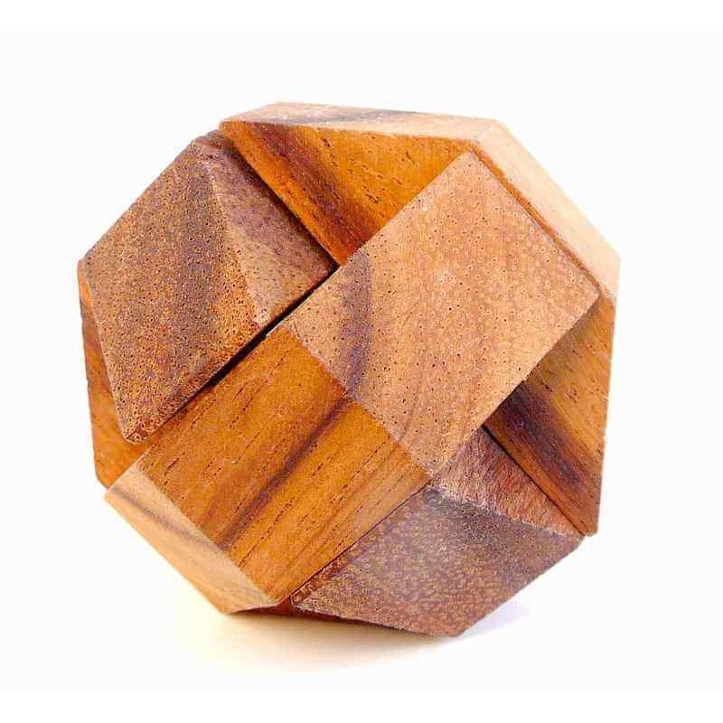 Rompecabezas con forma de hexágono y compuesto por 6 piezas y 6 clavos. Este rompecabezas tiene una dificultad media por lo que es adecuado para principiantes a los que les gusten los retos.