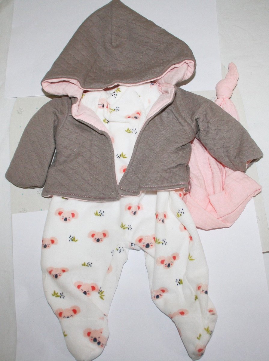 Incluye pepele con motivos de koalas, chaqueta y gorro.