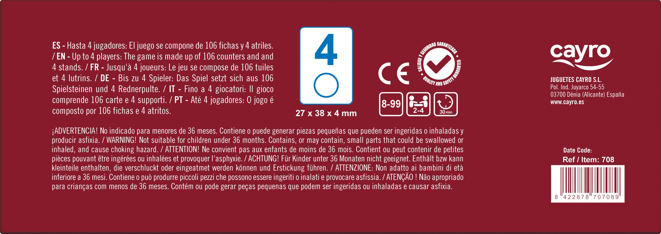 Simple y apasionante juego en el que cada jugador deberá combinar sus fichas, haciendo grupos de un mismo número en diferentes colores o escaleras de un mismo color para conseguir quedarse sin fichas. Versión hasta 4 jugadores.