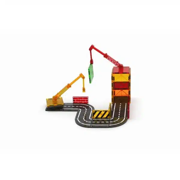 Este conjunto incluye dos grúas funcionales que pueden subir, bajar, extender y girar 360 grados, así como ruedas, caminos impresos y señales de advertencia para indicar la zona de construcción.