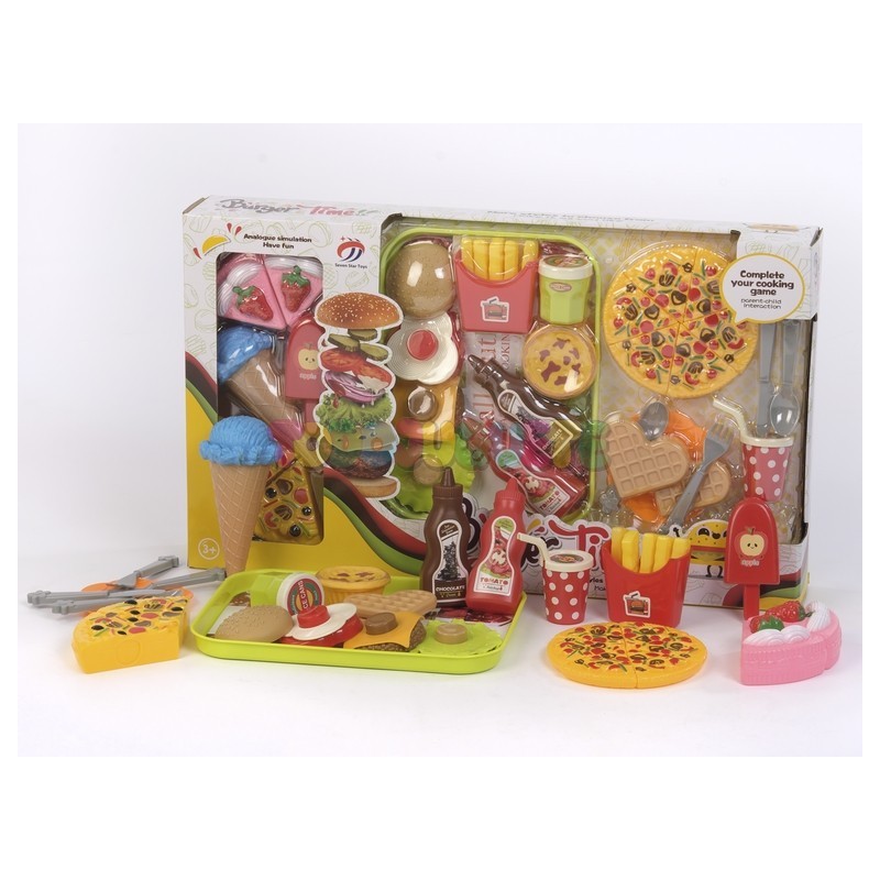 Set de merienda super completo: pizza, patatas, tarta, hamburguesa, gofre, helado, bebida, salsas…