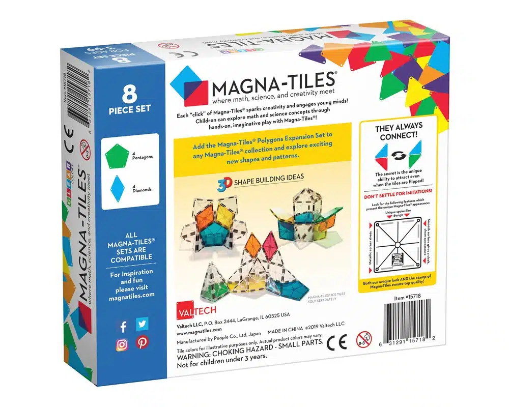 Formas poligonales únicas: el juego de 8 piezas de polígonos Magna-Tiles® incluye nuevas piezas en forma de rombos y pentágonos.