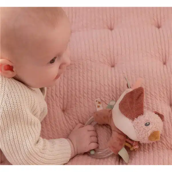 ¡Agarra, gira y agita! Este anillo sonajero con forma de pájaro es un divertido juguete que despertará la curiosidad de tu bebé. Agite sus alas de pana rosa o frote su suave barriga. El anillo transparente contiene 3 pequeñas cuentas de colores que empiezan a sonar cuando tu bebé juega con este divertido juguete. El sonajero mejora la coordinación ojo-mano y estimula los sentidos.
