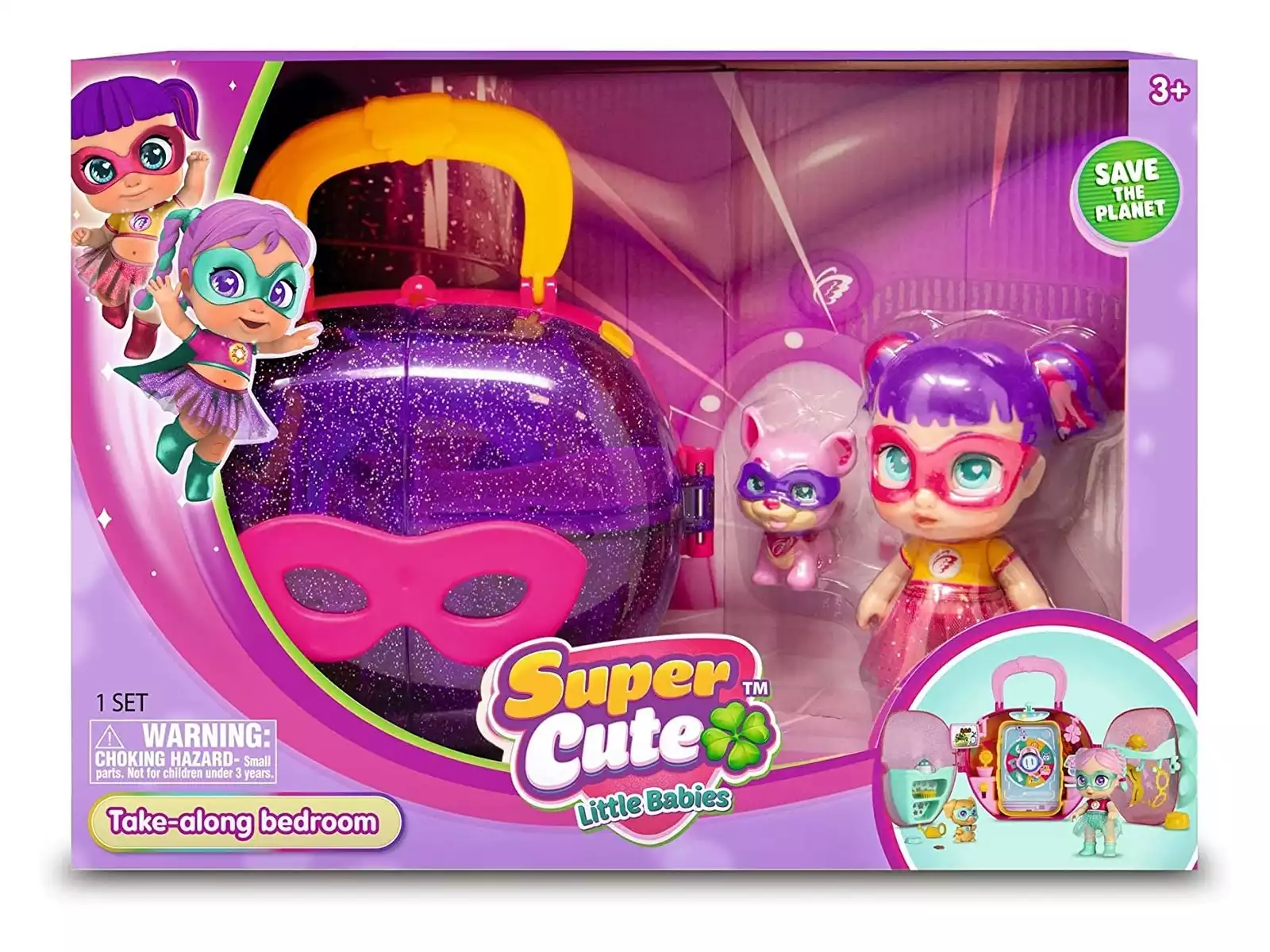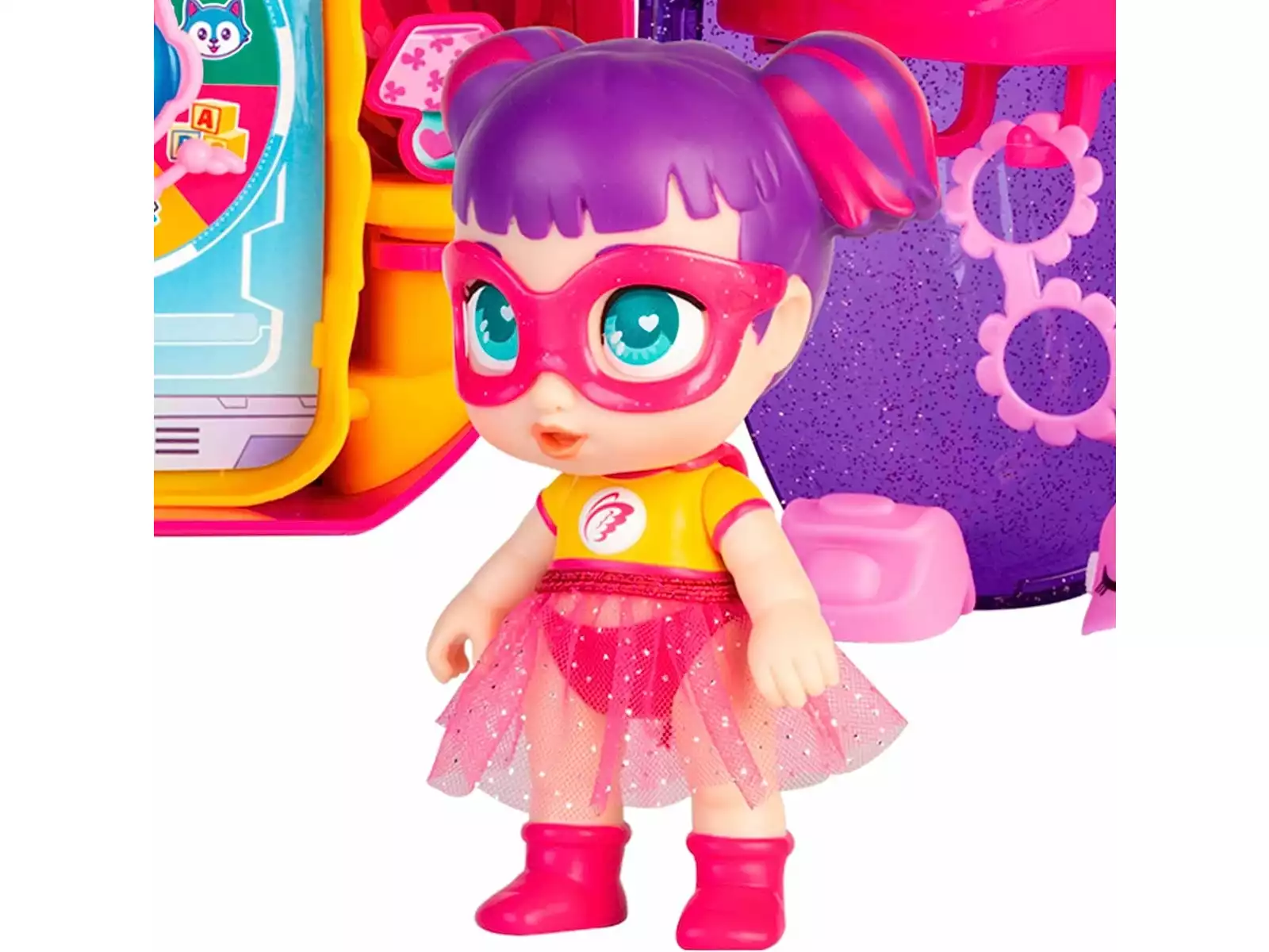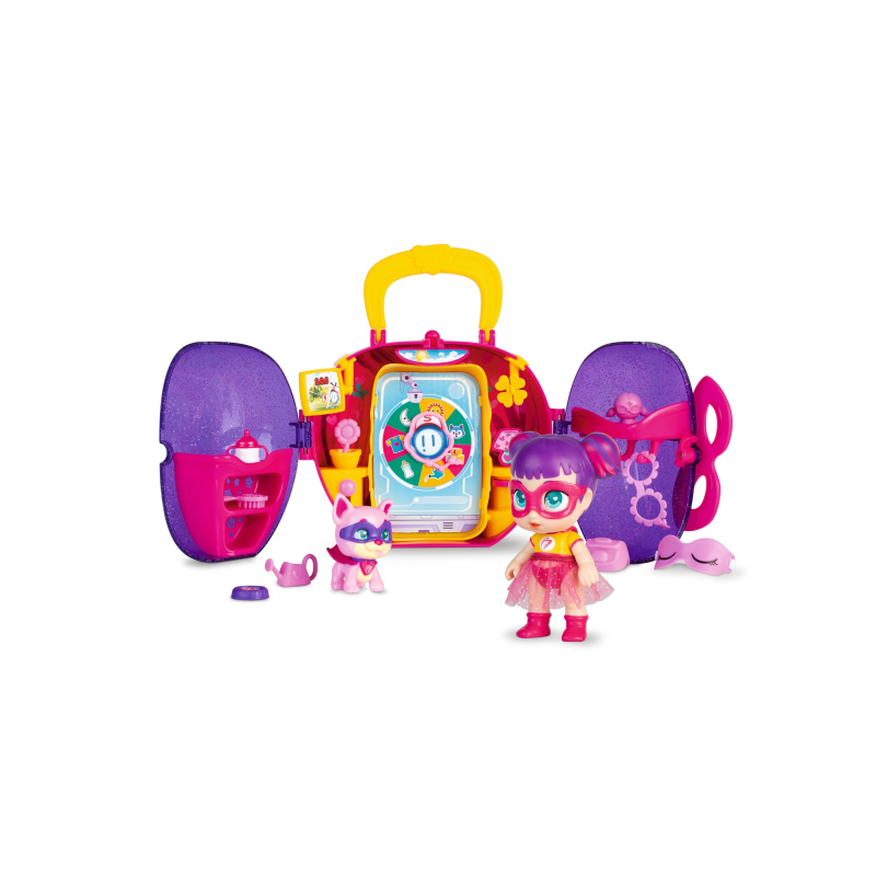 El set incluye la superheroína Sisi, con pelo de color llamativo, camiseta y una falda de tul. Pero Sisi, no está sola ya que viene, acompañada de una mascota, un pequeño perrito con antifaz que irá contigo a vivir miles de aventuras.