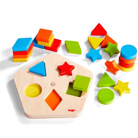 Cinco formas buscan su lugar en este carrusel, pero ¡ojo! ¡El color cambia en cuanto se gira la placa superior! Ficha, cámbiate: ¿quién encontrará las figuras adecuadas y las encajará en las ranuras correctas? Así, de una manera lúdica y como quien no quiere la cosa se va educando la habilidad de clasificar. ¡Un divertido juego de giros y más giros!