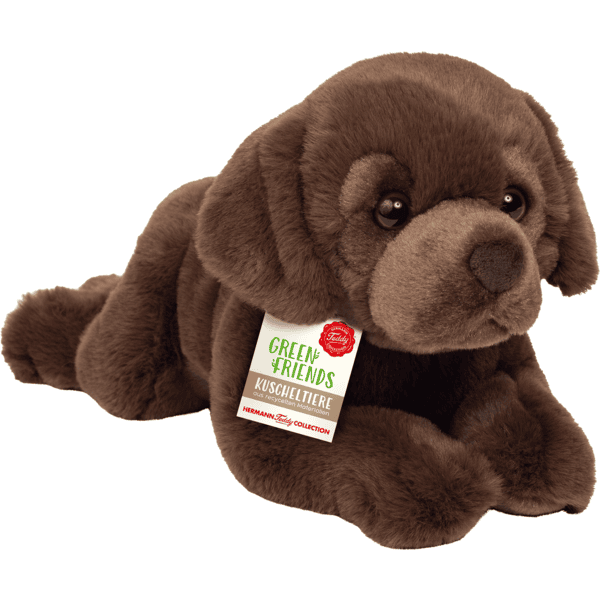 - El labrador marrón chocolate tumbado de 32 cm de altura y mirada leal es un representante especialmente cariñoso de la nueva gama » Green Friends » de la Colección Hermann Teddy y está fabricado con más del 80% de materiales reciclados