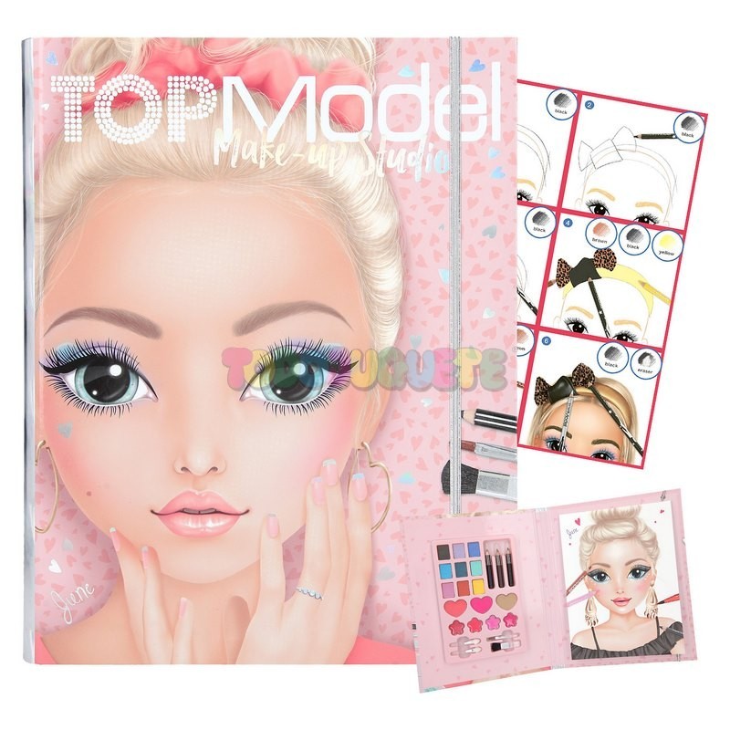 Con la carpeta TOPModel Make-up Studio podrás experimentar con todas tus ideas de maquillaje y llevarlas a la práctica. Incluye un bloc con las caras de modelos de TOPModel para colorear. Además, una paleta de maquillaje con 9 sombras de ojos (0,8 g cada una), 3 coloretes (2,5 g cada uno), 4 gloss labiales (0,6 g cada uno), 3 eye liner (0,7 g cada uno) y 4 pinceles.