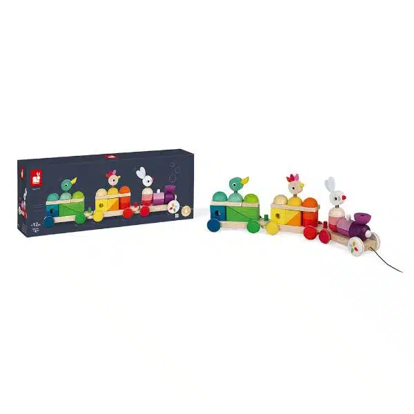 ¡Bienvenidos a bordo del tren gigante Zigolos! ¡Toma asiento, el tren está a punto de salir! Este juguete de madera 2 en 1 es un juguete de arrastre de primera infancia para ayudar a los bebés a desarrollar su motricidad, pero además es un juego de apilar. Gracias a los distintos bloques que se ponen en los vagones, a partir de 1 año los bebés aprenderán las formas y los colores mientras se divierten. ¡El tren gigante Zigolos es un completo juguete que conquistará al niño especialmente por sus bonitos colores y los divertidos animales de los vagones! ¡No es de extrañar, ya que su cabeza se balancea en cuanto el tren se pone en marcha gracias al muelle del cuello! ¡El pato, la gallina y el conejo están listos para descubrir el universo del bebé! El niño puede reconstruir como en el ejemplo o combinar los bloques de madera como quiera. Para mayor comodidad, las ruedas son silenciosas gracias a la goma antideslizante. Longitud de la cuerda: 50 cm. Pintura al agua.