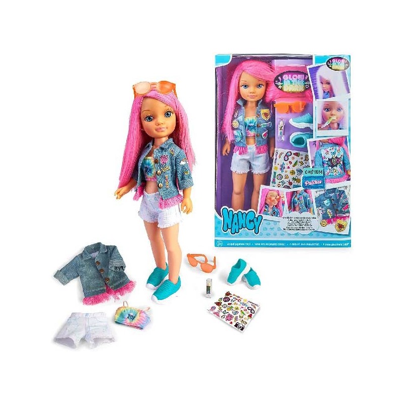 Nancy va vestida con ropa muy moderna: una cazadora vaquera con dibujos, unos shorts y un crop top tye dye y unas sneackers con plataforma.