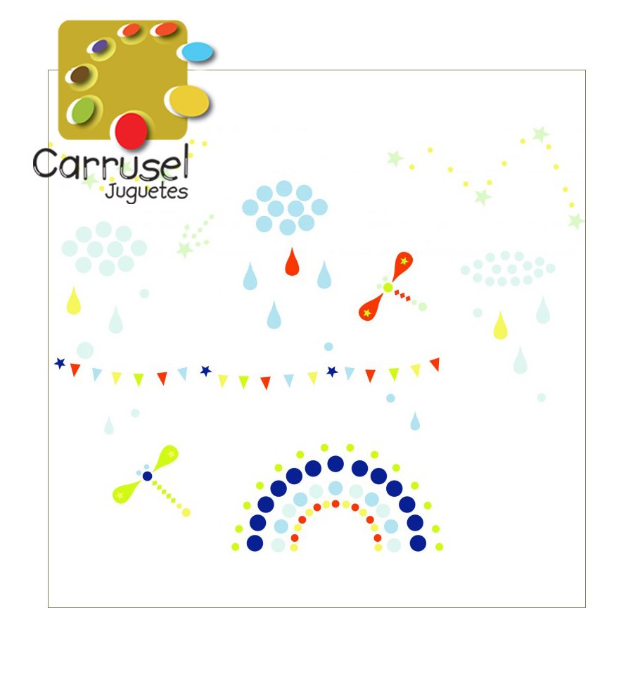 Estrellas, gotas de lluvia, círculos, triángulos… Pegatinas decoractivas llenas de colorido y movimiento apra dejar volar la imaginación.