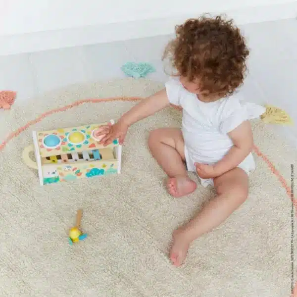 ¡La primavera ha llegado al cuarto del bebé! Flores y preciosos animales se dan cita en este bonito juego de habilidad de madera. Permitirá al bebé a partir de 18 meses desarrollar su destreza mientras se divierte. El xilófono para golpear Pure es un juego dos en uno: un martillo en forma de abeja para golpear las tres bolas que caen haciendo sonar las teclas del xilófono, que a su vez es extraíble para poder jugar con él en todas partes. El niño empezará a reconocer los colores colocando cada bola en el agujero del color correcto. Estimulará sus sentidos, imaginará y creará sus primeras historias.